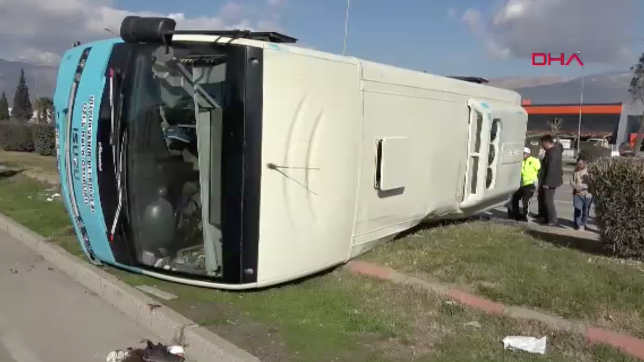 Şehir merkezinden hastaneye giden B.D.'nin kullandığı hafif ticari araç, kontrolden çıkarak önce refüje ardından aynı yönde giden Fatih Abacı'nın (45) kullandığı özel halk otobüsüne çarptı. Çarpmanın etkisiyle özel halk otobüsü, kaldırıma çıkıp devrildi. O sırada panikleyen H.A.'nın kullandığı otomobil de elektrik direğine çarptı.