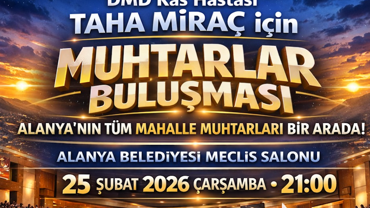 Alanya’nın tüm mahalle muhtarları, 25 Şubat Çarşamba günü saat 21.00’da Alanya Belediyesi Meclis Salonu’nda düzenlenecek “Muhtarlar Buluşması”nda bir araya gelecek. Gecede, Taha Miraç’ın tedavi sürecine destek olmak amacıyla canlı yayında bağış çağrısı yapılacak. Kampanya kapsamında 1 balon bedeli 100 TL olarak belirlenirken, vatandaşlar gece boyunca yayına katılarak destek verebilecek. Programın moderatörlüğünü Dilber Özsoy Okur ve Av. Ömer Demir üstlenecek. Yayın, “dmd.tahamirac” kanalı üzerinden canlı olarak izlenebilecek.