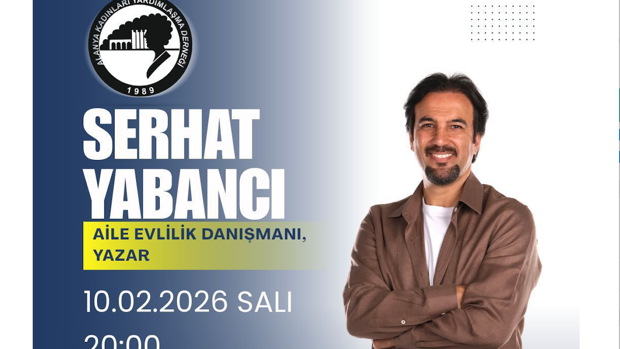 Alanya’da aile içi iletişimin güçlendirilmesi ve sağlıklı ilişki dinamiklerinin desteklenmesi amacıyla önemli bir farkındalık çalışması başlatıldı. Alanya Kadınları Yardımlaşma Derneği, toplumun temel yapı taşı olan aile kurumuna dikkat çekmek için anlamlı bir organizasyona imza atıyor. Dernek, aile ve evlilik danışmanı, yazar Serhat Yabancı’yı Alanya’ya davet ederek, aile içi iletişim, eşler arası anlayış ve sağlıklı ilişkilerin ele alınacağı bir söyleşi programı düzenliyor. “Mutlu Eşler, Mutlu Aile” başlığıyla gerçekleştirilecek program, 10 Şubat 2026 Salı günü saat 20.00’de Alanya Sanayi ve Ticaret Odası (ALTSO)’nda yapılacak.