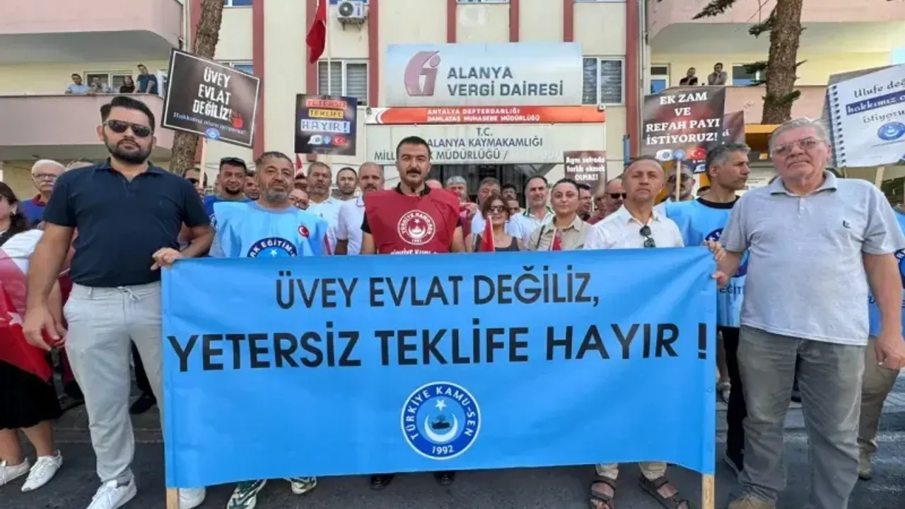 TÜRK Eğitim-Sen, kamu çalışanlarının maaş artışları ve sosyal haklarıyla ilgili taleplerinin karşılanmadığı gerekçesiyle bugün Türkiye genelinde iş bırakma eylemi gerçekleştirdi. Alanya’da Vergi Dairesi önünde toplanan sendika üyeleri, alın terlerinin karşılığını istediklerini dile getirdi. Topluluk adına açıklama yapan Antalya 2 Nolu Şube Başkanı Onur Nimet Üner, açıklamasında şu ifadelere yer verdi;