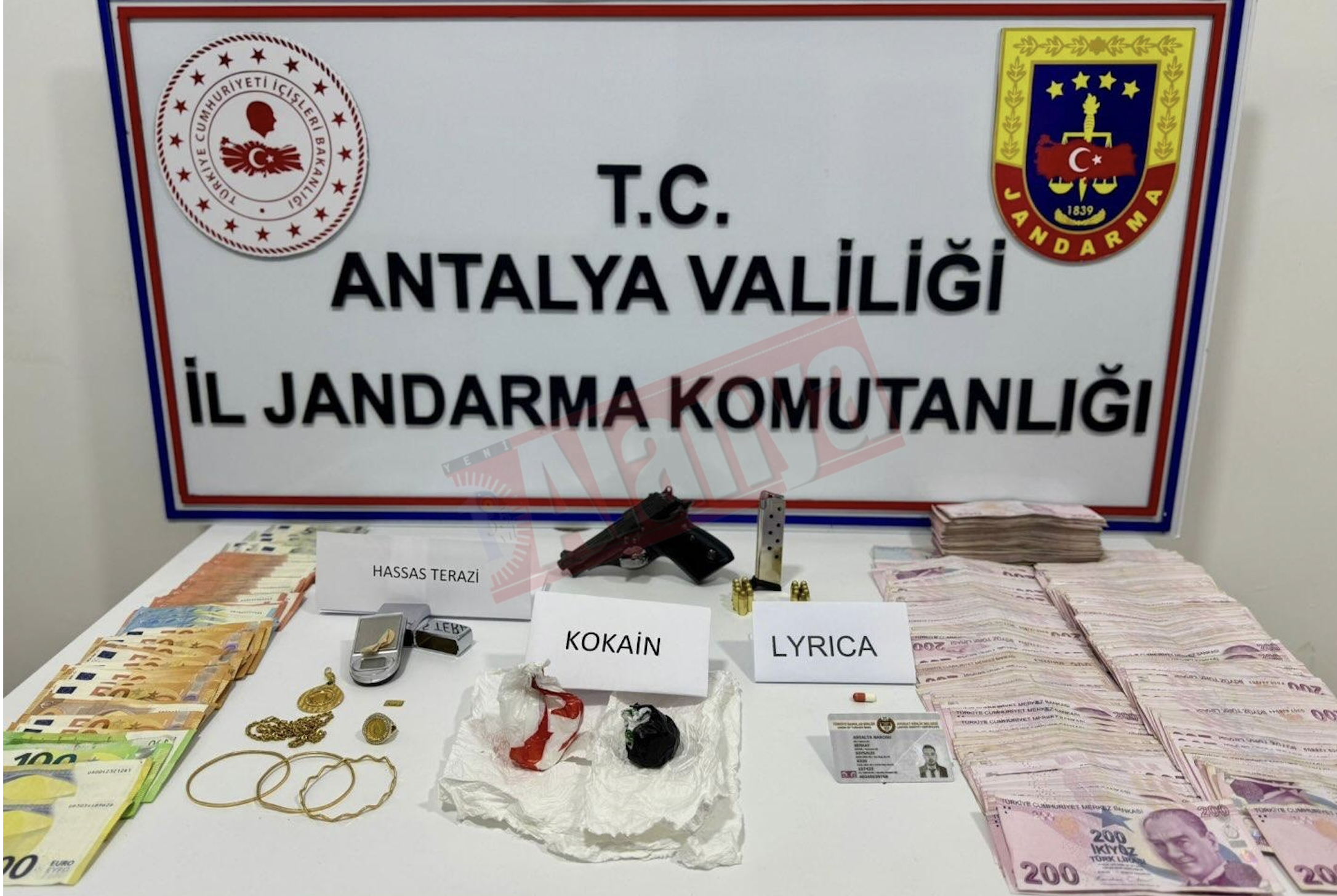 Alanya İlçe Jandarma ekiplerince evde yapılan aramalarda; 93 gram kokain, 1 adet hassas terazi, 1 adet Lyrica sentetik hap, 123.690 TL ve 1915 Euro suç geliri olduğu değerlendirilen para, 7 adet ziynet eşyası, 1 adet avukat kimliği, 1 adet Beretta marka tabanca, tabancaya ait 2 şarjör ve 14 adet fişek ele geçirildi. Evde yakalanan şüphelilerden İ.A (30) ve kadın M.G(23) Mahmutlar Jandarma Karakol Komutanlığında ifadeleri alınan 2 şüpheliler sevk edildikleri Alanya Nöbetçi Cumhuriyet Savcılığınca tutuklama istemiyle Nöbetçi mahkemeye sevk edilen kadın M.G Adli Kontrol şartıyla imza karşılığı ile serbest bırakılırken şüpheli İ.A Uyuşturucu Madde Ticareti yapmak suçundan tutuklanarak Alanya L. Tipi Kapalı Cezaevine gönderildi. Mehmet Al