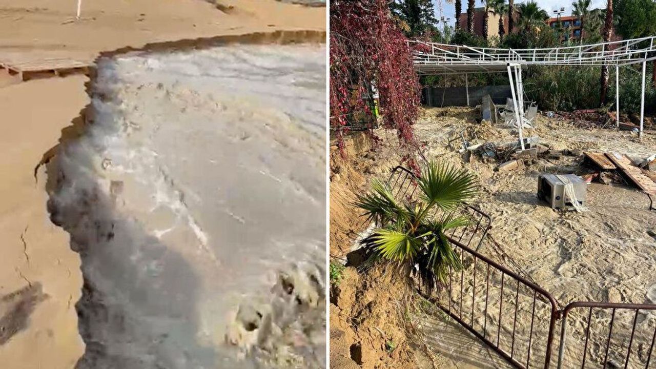 Alanya’nın İncekum Mahallesi’nde etkili olan şiddetli yağış sonrası taşan dere, 5 yıldızlı otele ait sahil kafesini yıkarak büyük hasara yol açtı.