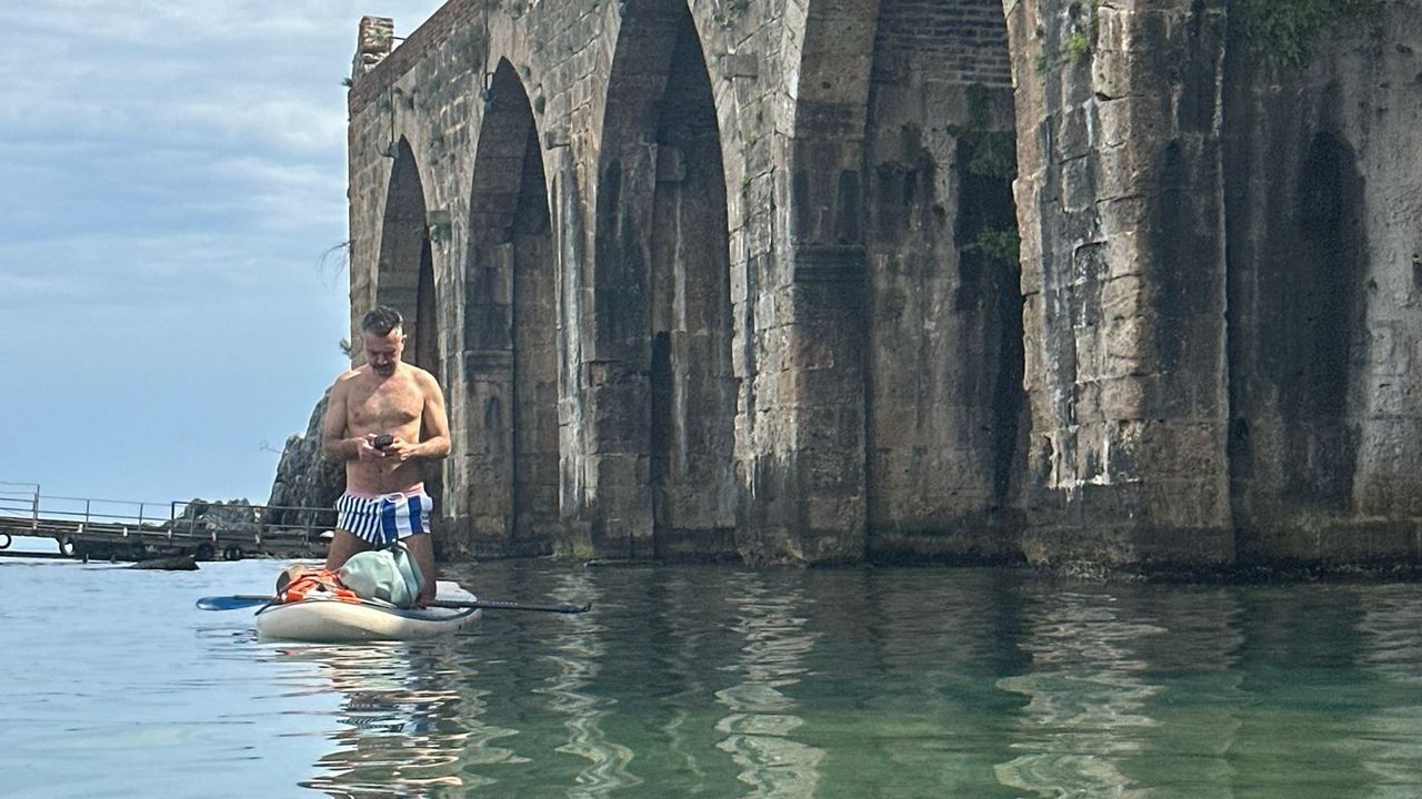 Alanya’nın tanınmış turizmcilerinden Hacı Ahmet Helvacı, sosyal medyada yaptığı yaratıcı paylaşımlara bir yenisini ekledi. Bu kez Alanya Tersanesi önünde paddle board (SUP) üzerinde görüntülenen Helvacı, tarihi dokunun ortasında verdiği pozla dikkat çekti. Denizin üzerinde ilerlerken telefonuyla meşgul olduğu anlar ise takipçilerinin ilgisini çekti.
