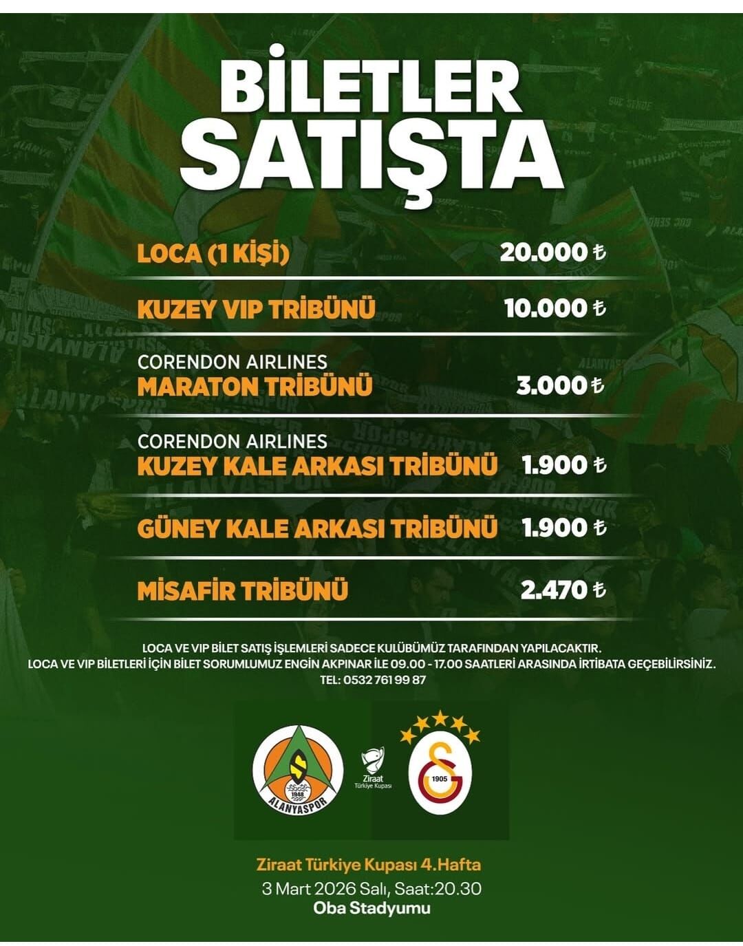 Açıklamada, loca ve VIP bilet satış işlemlerinin yalnızca kulüp tarafından yapılacağı belirtildi. Loca ve VIP bileti almak isteyen taraftarların, hafta içi 09.00–17.00 saatleri arasında kulübün bilet sorumlusu ile iletişime geçebileceği ifade edildi.