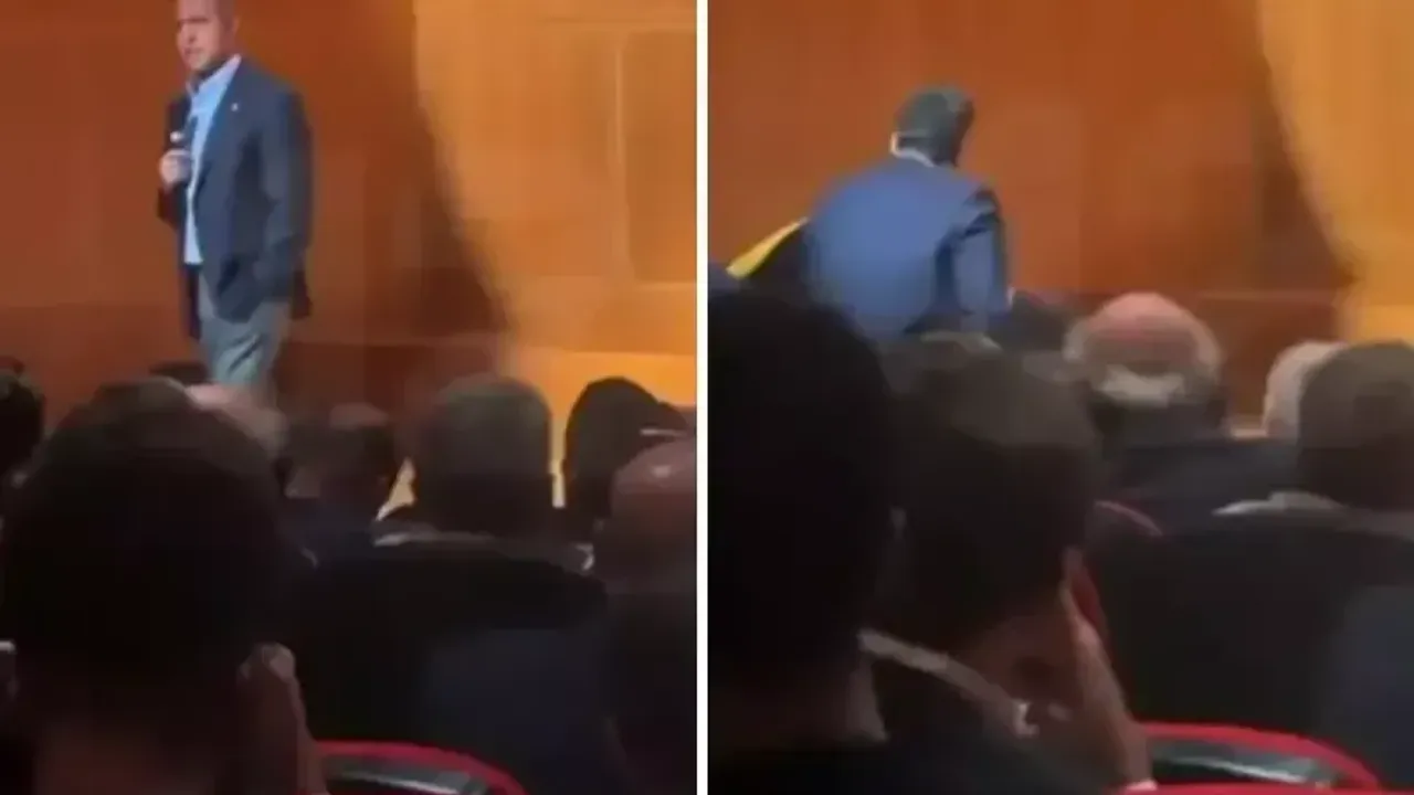 Koç konuşmasının bir bölümünde, konuşma yaptığı platformun en uc kısmına kadar gelince bir anda dengesini kaybederek yere düştü.