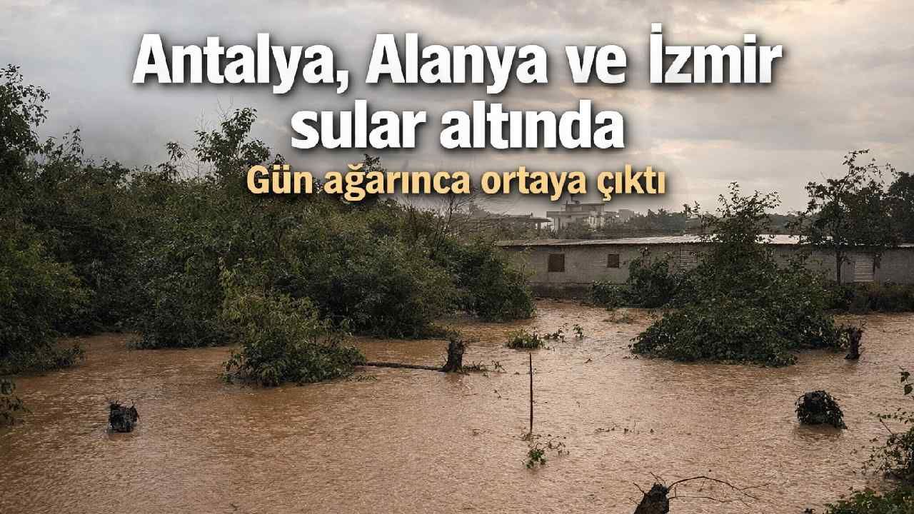 Meteoroloji uyarılarının ardından Antalya, Alanya ve İzmir’de etkili olan sağanak yağış gece boyunca birçok noktada hayatı zorlaştırdı. Sabahın ilk ışıklarıyla birlikte taşkın, su baskını ve yol hasarlarının boyutu daha net görüldü. Bazı bölgelerde araçlar yolda kaldı, zemin katları su bastı, dere yatakları taştı.