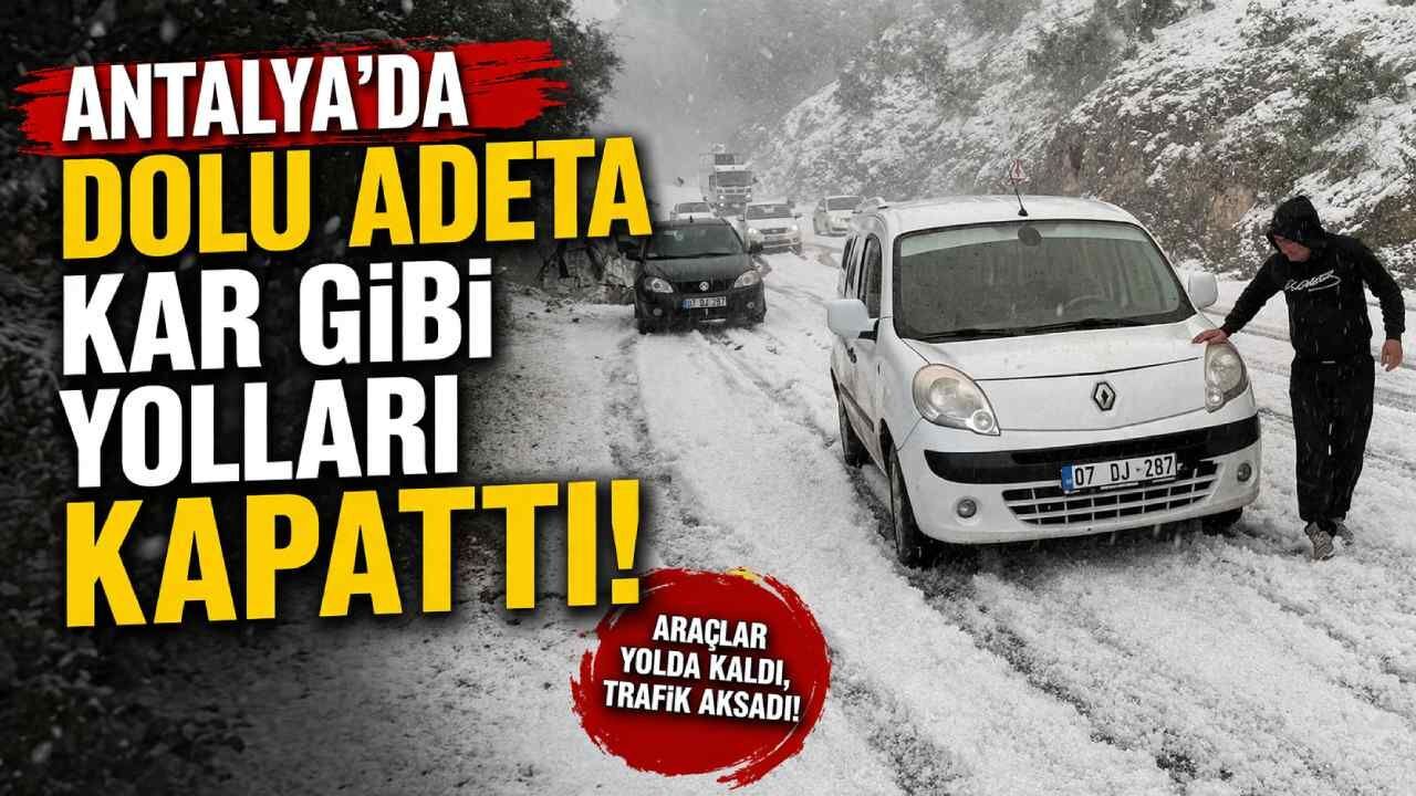 Gündoğmuş’ta aniden bastıran dolu yağışı yolları beyaza çevirdi. Araçlar yolda kaldı, trafik aksadı.
