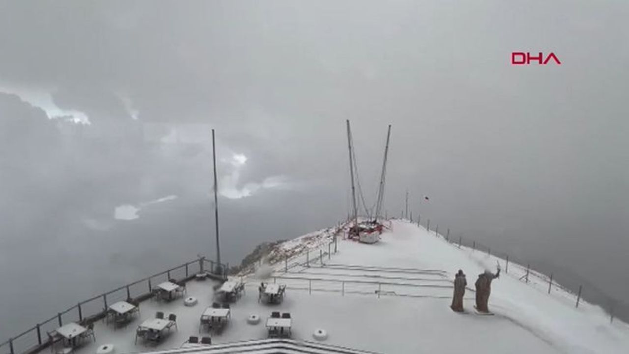 Kemer'deki 2 bin 365 metre rakımlı Tahtalı Dağı'nın zirvesine kar yağdı.