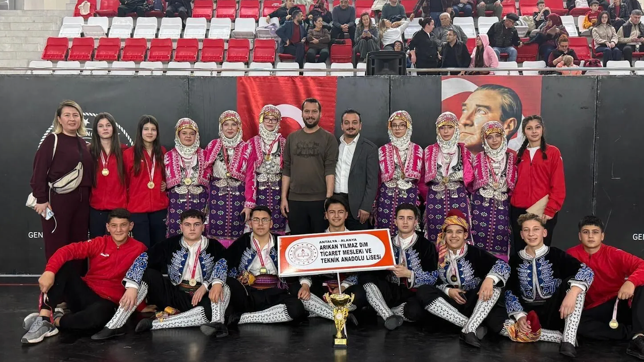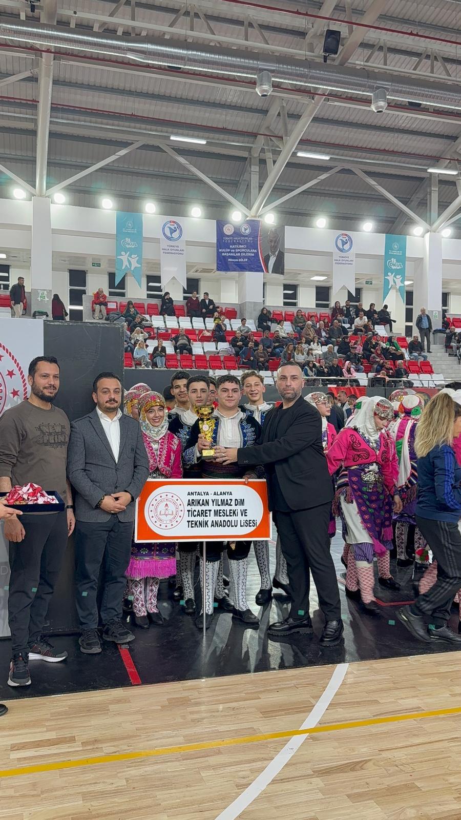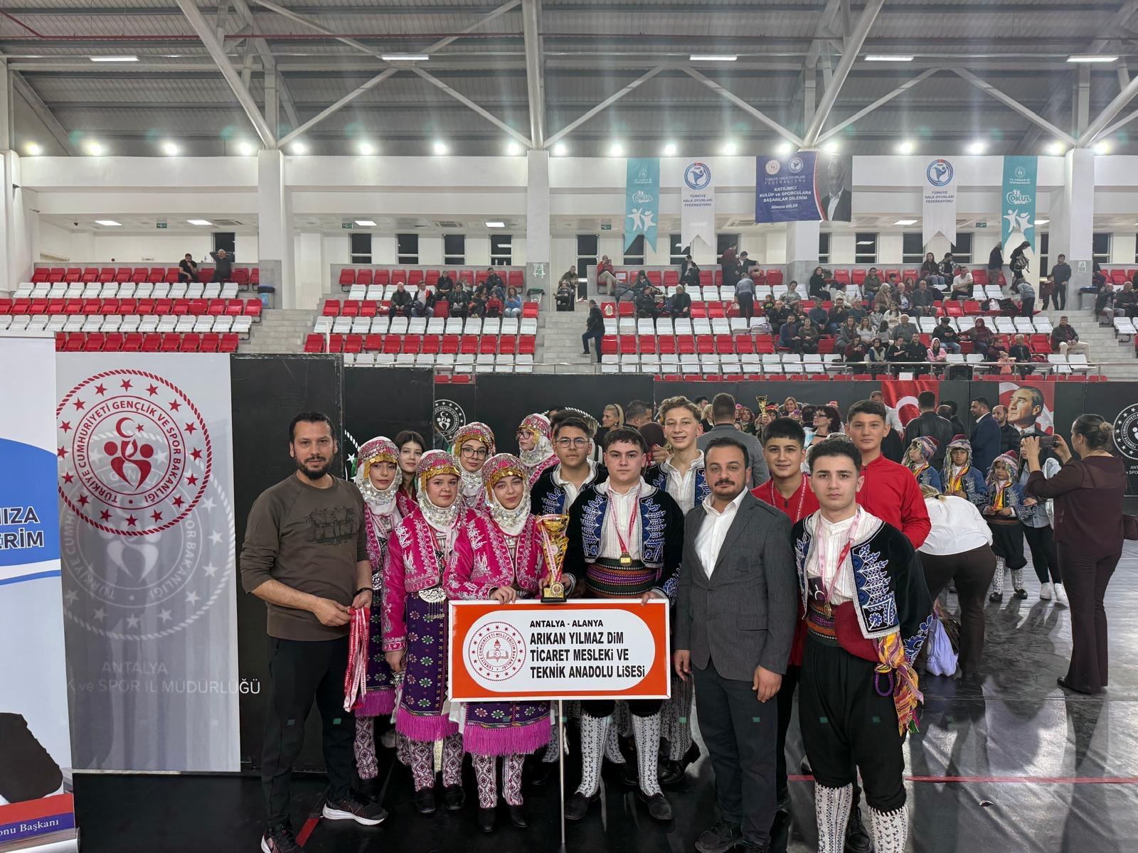 TÜRKİYE Halk Oyunları Federasyonu tarafından düzenlenen Antalya Halk Oyunları İl Birinciliği Yarışması’nda, Arıkan Yılmaz Dim Ticaret Mesleki ve Teknik Anadolu Lisesi büyük bir başarıya imza attı. Mustafa Öztürk gözetiminde yarışmaya hazırlanan Arıkan Yılmaz Dim Mesleki ve Teknik Anadolu Lisesi Halk Oyunları Ekibi, sergilediği performansla Antalya İl Birincisi oldu. Öğrencilerin disiplinli çalışması ve sahnedeki uyumu, jüri tarafından tam not alırken, elde edilen bu derece okul camiasında büyük gurur yaşattı.