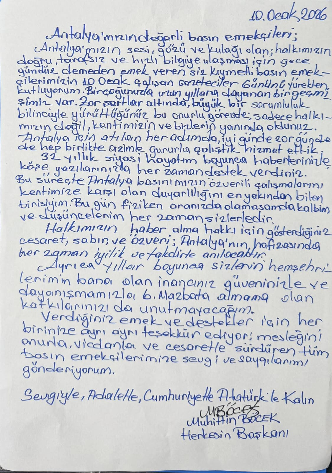 Başkan Böcek mektubunda, Antalya basını ile uzun yıllara dayanan bir mesai birliği olduğunu vurguladı. Siyasi hayatı boyunca gazetecilerin desteğini her zaman hissettiğini belirten Böcek, şu ifadeleri kullandı: