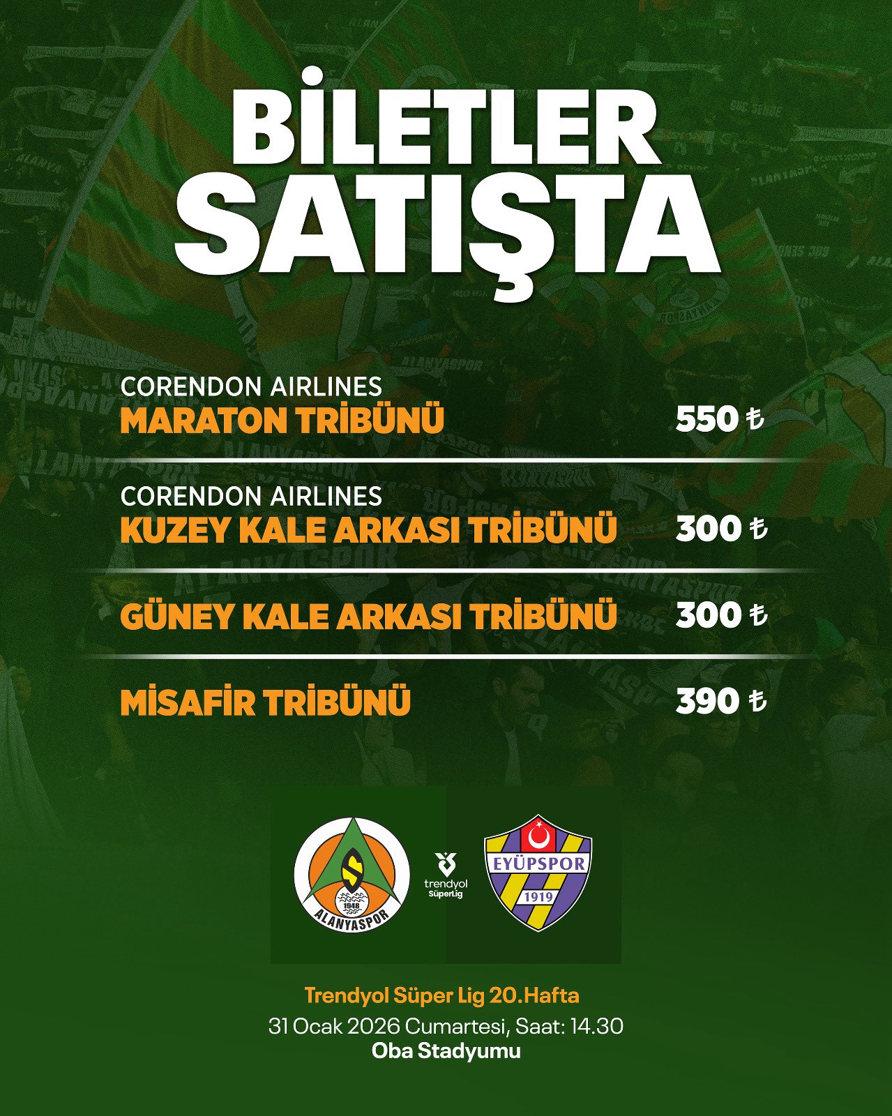 Kulüpten yapılan paylaşımda, bilet fiyatlarının, Maraton Tribünü 550 TL, Kuzey ve Güney Kale Arkası tribünleri 300 TL, Misafir Tribünü de 390 TL olarak belirlendiği açıklandı.