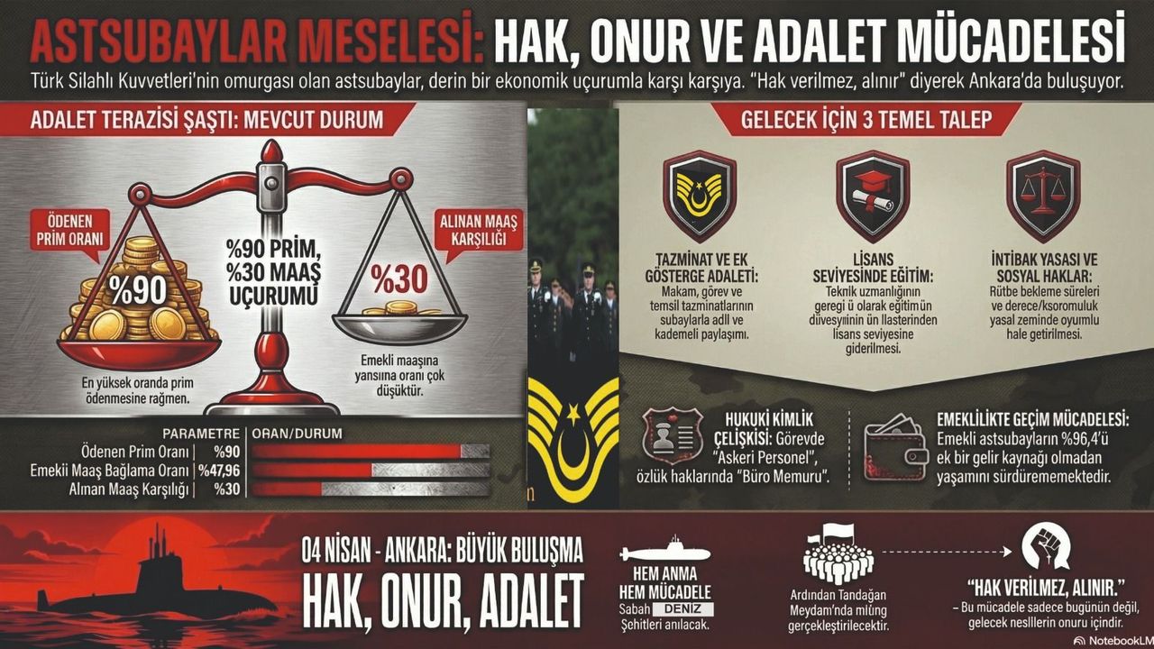 TÜRKİYE’NİN farklı illerinden binlerce emekli astsubay ve aileleri, 4 Nisan 2026 Cumartesi günü saat 13.00’te Ankara Anıtpark'ta düzenlenecek “Büyük Astsubay Mitingi” için bir araya gelmeye hazırlanıyor. Organizasyonun, hem anma hem de hak arama mücadelesi niteliği taşıması dikkat çekiyor. Etkinlik kapsamında sabah saatlerinde Deniz Şehitleri’ni Anma Günü dolayısıyla dualar edilecek, şehitler anılacak. Ardından katılımcılar, mesleki hak taleplerini kamuoyuna duyurmak üzere meydanda buluşacak.