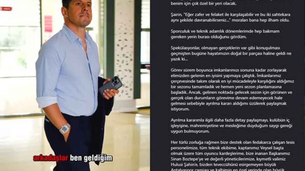 Emre Belözoğlu, sosyal medya hesabından yaptığı paylaşımda, "Geldiğim günden itibaren bize gösterilen sevginin, ilgi alakanın benim için çok özel bir yeri olacak. Şairin, 'Eğer zafer ve felaket ile karşılaşabilir ve bu iki sahtekara aynı şekilde davranabilirseniz' mısraları bana hep ilham oldu. Sporculuk ve teknik adamlık dönemlerimde hep bakmam gereken yerin burası olduğunu gördüm. Spekülasyonlar, olmayan gerçeklerin var gibi konuşulması geçmişten bugüne hayatımızın doğal bir parçası haline geldi ne yazık ki. Görev sürem boyunca imkanlarımızı sonuna kadar zorlayarak elimizden gelenin en iyisini yapmaya çalıştık. İmkanlarımız çerçevesinde takım olarak en iyi mücadeleyle karşılığını aldığımız bir sezonu tamamladık ve hemen yeni sezon planlamasına başladık. Ancak, gelinen noktada gelecek sezon için görünen ve gerçek olan durumların görevime devam edemeyecek hale gelmesi sebebiyle ayrılma kararı aldığımı üzülerek paylaşmak istiyorum. Ayrılma kararımla ilgili daha fazla detay paylaşmayı, kulübün iç işleyişine, mahremiyetine ve mesleğime duyduğum saygı gereği uygun bulmuyorum" ifadelerine yer verdi.