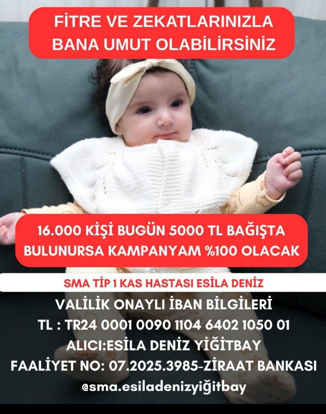 Kampanyanın tamamlanması ve Esila'nın ilacına kavuşabilmesi için somut bir hedef belirlendi: Bugün 16 bin kişi 5 bin TL bağışta bulunursa, kampanya yüzden 100'e ulaşacak ve Esila nefes alacak.