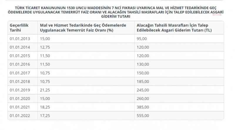 Öte yandan, alacaklıya yapılan geç ödemelere ilişkin faiz oranı 2022 yılında yüzde 17,25, alacağın tahsili masrafları için talep edilebilecek asgari gider tutarı da 555,00 liraydı.