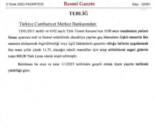 Resmi Gazete'nin bugünkü sayısında yayınlanan TCMB tebliğine göre, mal ve hizmet tedarikinde alacaklıya yapılan geç ödemelere ilişkin temerrüt faiz oranının sözleşmede öngörülmediği veya ilgili hükümlerin geçersiz olduğu hallerde uygulanacak faiz oranı yüzde 11,75 olarak belirlendi. Tebliğ uyarınca, alacağın tahsili masrafları için talep edilebilecek asgari gider tutarı da 800 TL olacak.