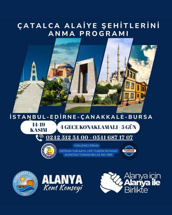 Programın en önemli bölümlerinden biri, 17 Kasım tarihinde Çatalca’da düzenlenecek olan anma töreni olacak. Alanya Kent Konseyi heyeti, Alaiye Taburu’nun kahramanlık destanını yazdığı bu topraklarda, Çatalca Alaiye Şehitliği’nde bir kez daha aziz şehitlerimizi rahmet ve minnetle anacak.