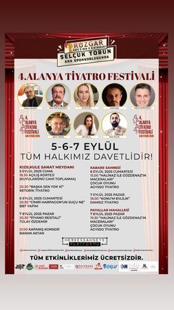 ALANYA, kültür ve sanat tutkunlarını 5-7 Eylül tarihleri arasında gerçekleşecek 4. Alanya Tiyatro Festivali için ağırlamaya hazırlanıyor. Rüzgar Cafe & Bar & Restaurant sahibi Selçuk Torun ana sponsorluğunda düzenlenen festival, Kızılkule Sanat Meydanı başta olmak üzere şehrin farklı noktalarında tiyatroseverlerle buluşacak. Festival programında Tamer Levent, Tarık Papuççuoğlu, Emine Ün, Ruhi Sarı, Hazım Körmükçü, Şahin Örgel, Elif Çelik ve İlker Kalay gibi ünlü oyuncular sahne alacak. Etkinliklerin tamamı halka ücretsiz olarak sunulacak. Festivalin gerçekleşmesinde destek veren sponsorlar arasında DİM Medya da yer alıyor. Festival kapsamında çocuklar için özel oyunlar ve yetişkin tiyatroları bir arada sunulacak. Ayrıca kapanış konseri ile üç günlük etkinlik, sanat dolu bir finalle tamamlanacak. Festivalle ilgili ayrıntılar organizasyonu düzenleyen Herkes Sahneye Platformu’nun instagram hesabından paylaşılmaya eidevam edecek. (İnstagram: herkessahneye) (Şerife ÇOBAN)