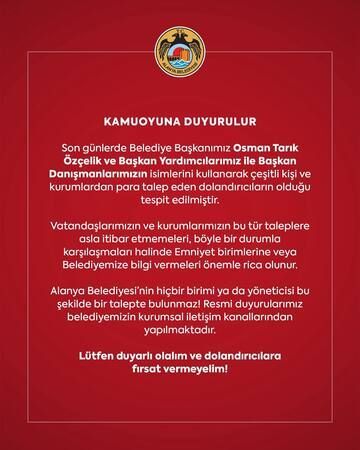 Alanya Belediyesi’nden yapılan resmi açıklamaya göre, son günlerde bazı dolandırıcılar, Belediye Başkanı Osman Tarık Özçelik, başkan yardımcıları ve danışmanlarının isimlerini kullanarak çeşitli kişi ve kurumlardan para talep etmeye başladı. Belediye, bu tür taleplerin tamamen asılsız ve hukuksuz olduğunu belirtti.