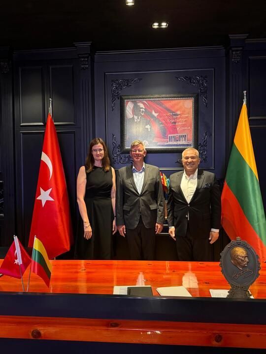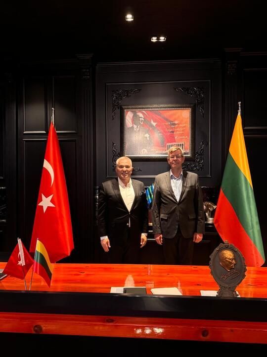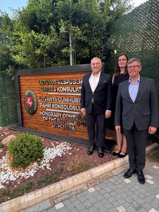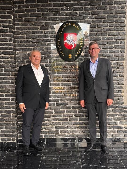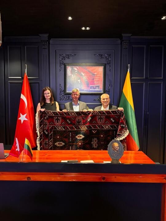 Litvanya Cumhuriyeti’nin Ankara Büyükelçisi Marius Janukonis ve Elçi Müsteşar Ieva Garsvaite’de Şahin’i vakıf merkezinde ziyaret ederek hayırlı olsun dileklerini ilettiler. Litvanya-Alanya arasındaki dostluk ve iş birliğini pekiştirme üzerine de verimli görüşmelerin yapıldığı ziyarette Şahin, geleneği bozmayarak Büyükelçi Janukonis’e yörük kültürünü temsil eden halı hediye etti.