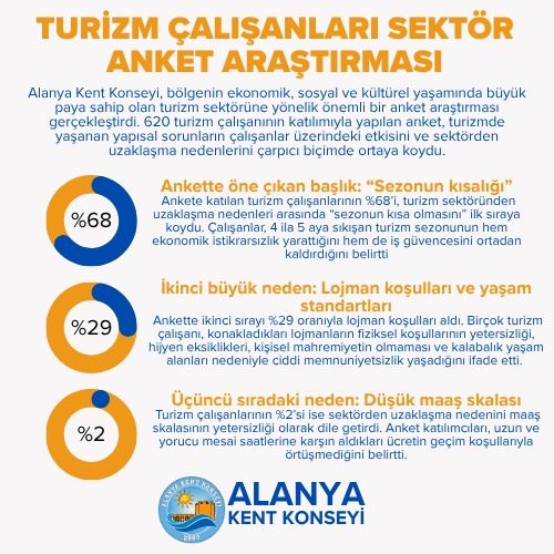 Anket sonuçlarını değerlendiren Alanya Kent Konseyi, turizm sektörünün sürdürülebilirliği için çalışan memnuniyetinin ve yaşam koşullarının iyileştirilmesi gerektiğini vurguladı. Konsey, sezonun uzatılması, lojman standartlarının denetlenmesi, çalışan ücretlerinin iyileştirilmesi ve sosyal hakların güvence altına alınması yönünde politika geliştirilmesinin kaçınılmaz olduğunu belirtti. Açıklamada, “Sonuç olarak, anket Alanya’nın turizm başarısının ardında görünmeyen bir emek zincirinin bulunduğunu bir kez daha hatırlattı. Kısa sezonlar, düşük yaşam koşulları ve yetersiz ücret politikaları sürdüğü sürece, turizmin temel direği olan çalışanların sektörden uzaklaşması kaçınılmaz görünüyor.