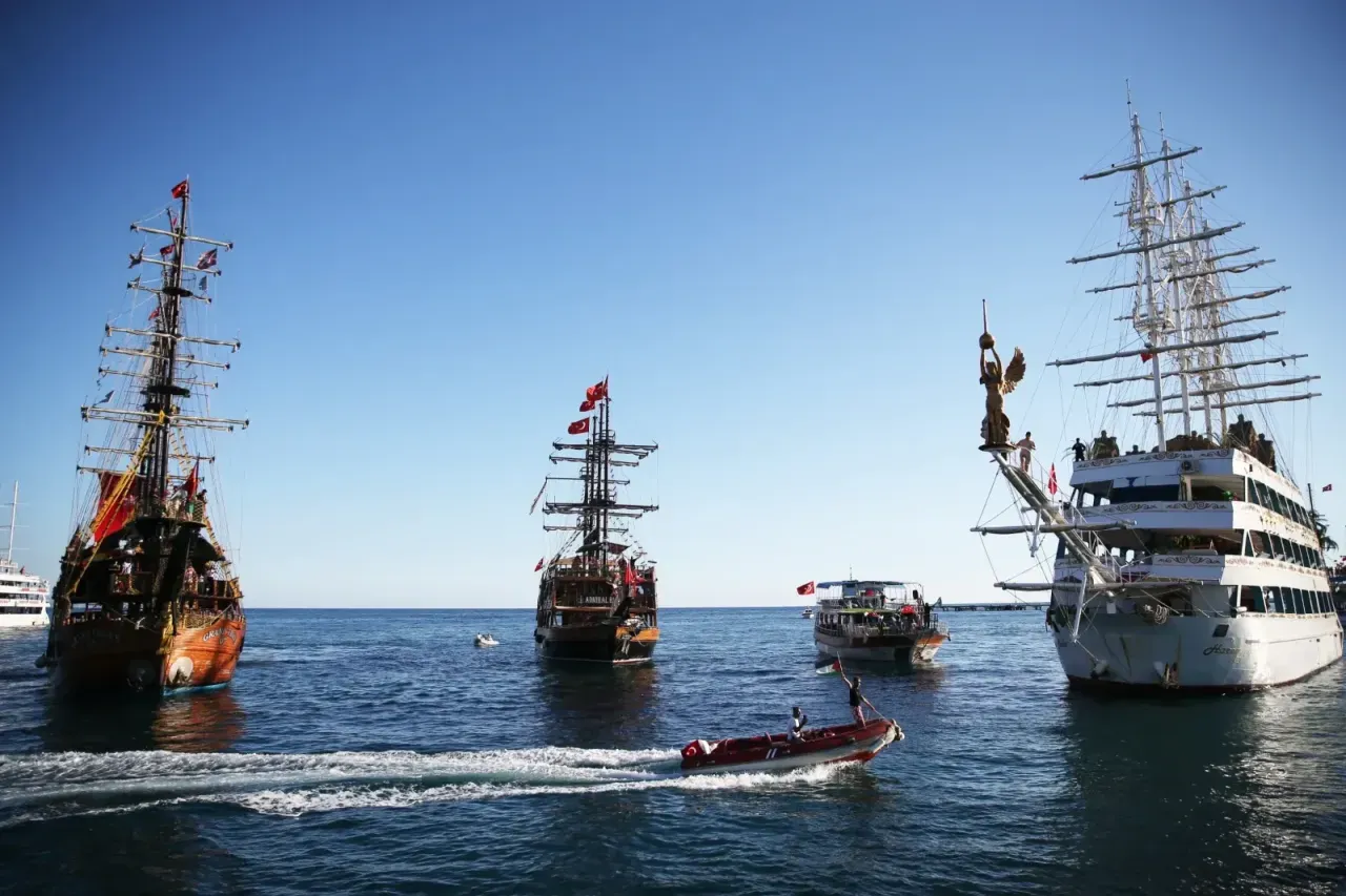 AK Parti Alanya İlçe Başkanlığınca Küresel Sumud Filosu'na destek için düzenlenen etkinlikte balıkçı barınağından çıkan tekneler denizde kortej oluşturdu.