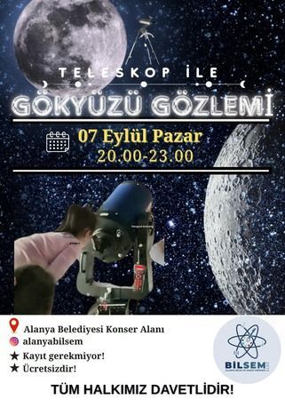 ALANYA Bilim ve Sanat Merkezi (BİLSEM), 7 Eylül Pazar günü Alanya Belediyesi Konser Alanı’nda halka açık teleskopla gökyüzü gözlemi etkinliği düzenleyecek. Saat 20.00 ile 23.00 arasında gerçekleşecek etkinlikte katılımcılar, uzman eğitmenler eşliğinde Ay’ı, gezegenleri ve yıldızları yakından inceleme fırsatı bulacak. Etkinliğe katılım ücretsiz olup, önceden kayıt yaptırma şartı bulunmuyor. Hava koşullarının elverişsiz olması durumunda gözlem, ileri bir tarihe ertelenecek. Alanya İlçe Milli Eğitim Müdürü Yusuf Yılmaz gökyüzünü keşfetmek isteyen tüm Alanya halkını etkinliğe davet etti. (Şerife ÇOBAN)