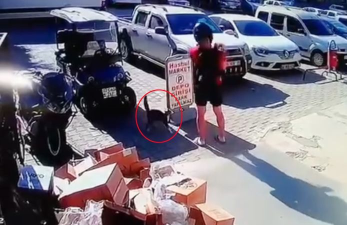 Güvenlik kamerası görüntülerinde, A.S.S.'nin motosikletiyle marketin önüne gelip yanındaki köpeğiyle indiği, bu sırada köpeğe yaklaşan kedinin saldırdığı, şüphelinin ise köpeğini kucağına alarak kediyi iki kez tekmelediği anlar yer aldı.