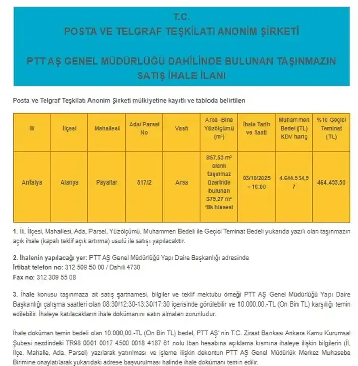 PTT Genel Müdürlüğü, Antalya’nın yanı sıra İstanbul, Ankara, İzmir, Yozgat, Şanlıurfa, Osmaniye, Aksaray, Trabzon, Manisa, Diyarbakır, Samsun, Malatya, Siirt, Kocaeli ve Gaziantep gibi illerde de mülklerini satışa çıkarıyor. En fazla taşınmazın Yozgat’ta bulunduğu belirtildi.