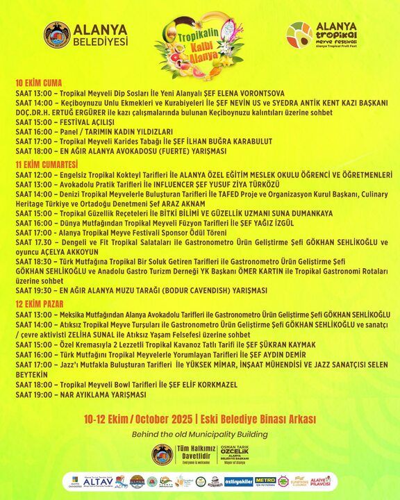 Alanya’nın tropikal meyve çeşitliliğinin tanıtımda önemli bir rol üstlenen 4. Alanya Tropikal Meyve Festivali için hazırlıklar sürüyor. Belediye Başkan Danışmanı Abdurrahman Açıkalın’ın başkanlığını yaptığı festival komitesinde Ziraat Odası Başkanı Tahir Göktepe, Avokado Üreticileri Birliği Başkanı Hilmi Sevilgen, Tropikal Meyve Üreticileri Birliği Başkanı Ali Hüddoğlu, Keçiboynuzu Üreticileri Birliği Başkanı Duran Yılmaz, tropikal meyve üreticileri ve ilgili müdürlükler yer alıyor. Festivalde ‘en ağır avokado, en ağır muz tarağı ve nar ayıklama’ yarışmaları yapılacak. (Haber MERKEZİ)