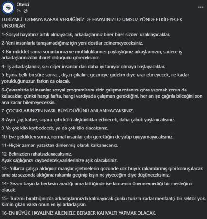 Alanya merkezli bir turizm çalışanının sosyal medyada paylaştığı, sektörde çalışmanın zorluklarını anlatan 16 maddelik paylaşım, kısa sürede on binlerce etkileşim aldı. Liste, hem sezonluk personelin hem de yıllardır turizm sektöründe çalışanların ortak duygularını yansıtıyor.