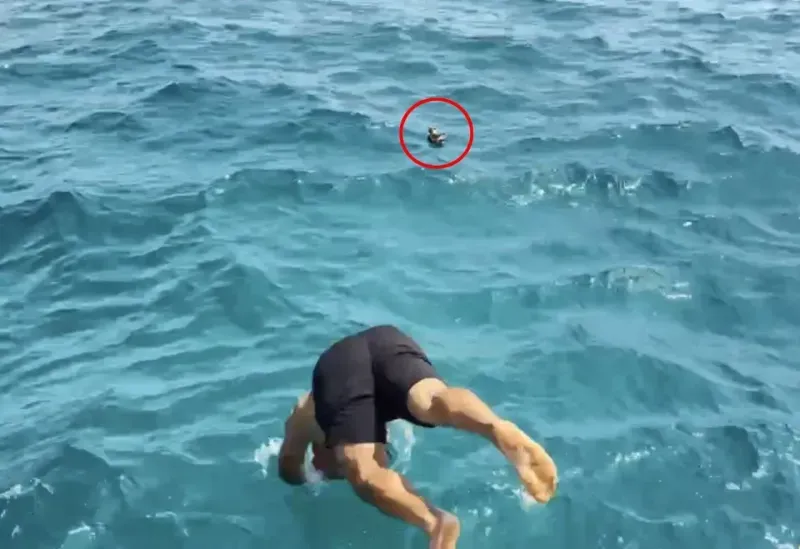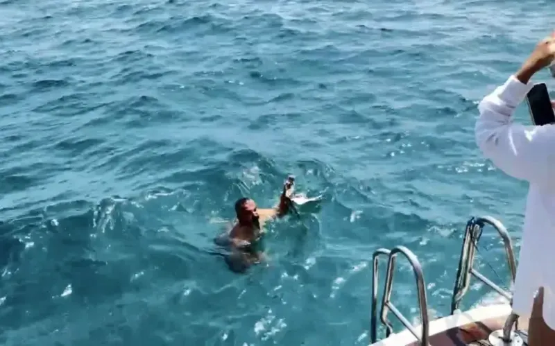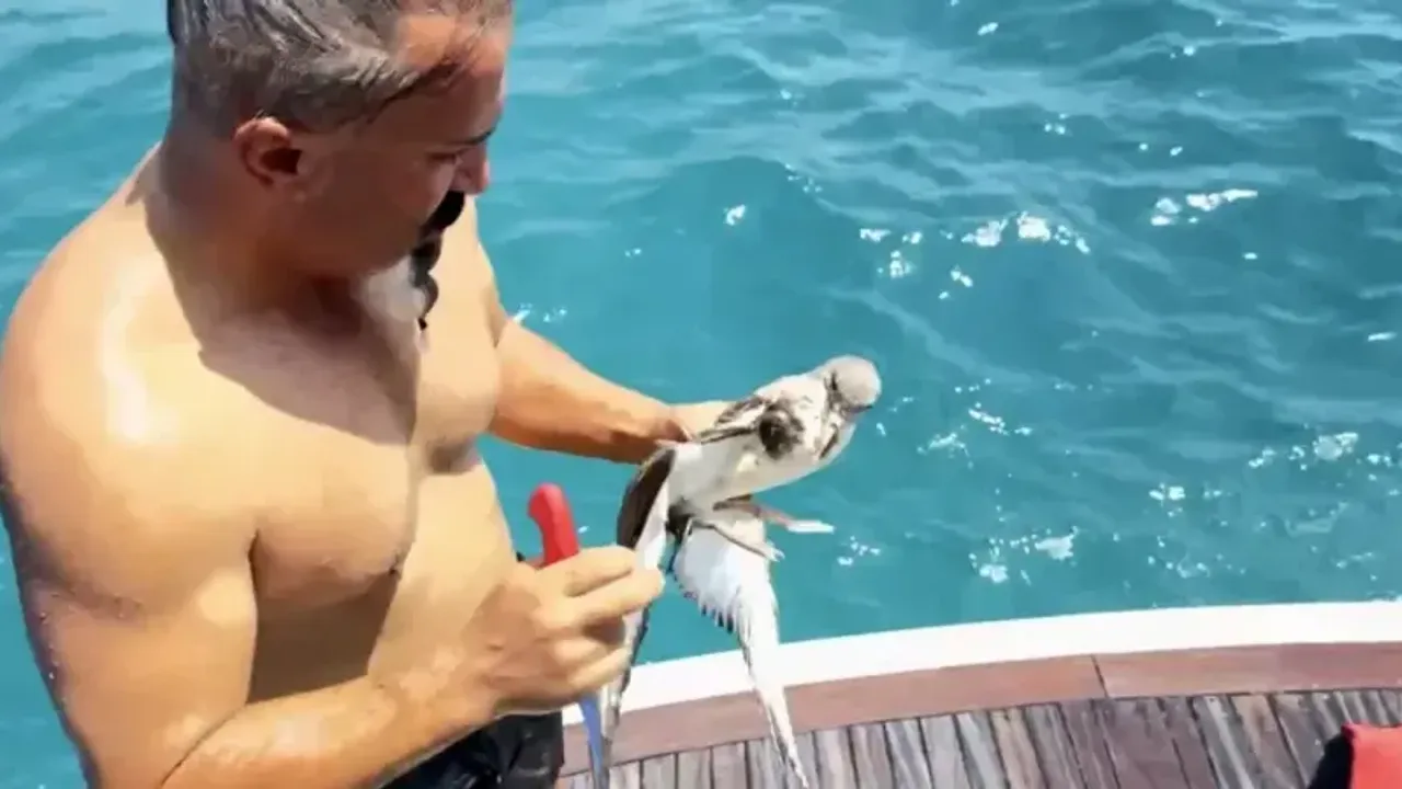 Alanya’da oltaya takılarak bitkin düşen martı, tekne kaptanının denize atlayarak yaptığı müdahaleyle kurtarıldı