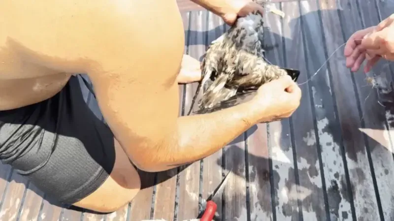 Martıyı kurtaran kaptan Turgay Meşe, "Bir hayvanı daha kurtardık. Balık yakalamak için ekmek sarıp attığınız oltaları unutuyorsunuz denizde. Bu hayvanlar da bu ekmekleri yiyerek zarar görüyor. Çevremize, doğamıza sahip çıkmak zorundayız" dedi.