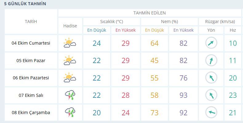 Asıl değişim 7 Ekim Salı günü yaşanacak. Hava sıcaklığı bir anda 28°C'ye düşerken, nem oranının %93'e kadar yükselmesiyle birlikte gök gürültülü sağanak yağış bekleniyor. Rüzgarın da güneybatı yönünden saatte 23 km hızla eseceği tahmin ediliyor.