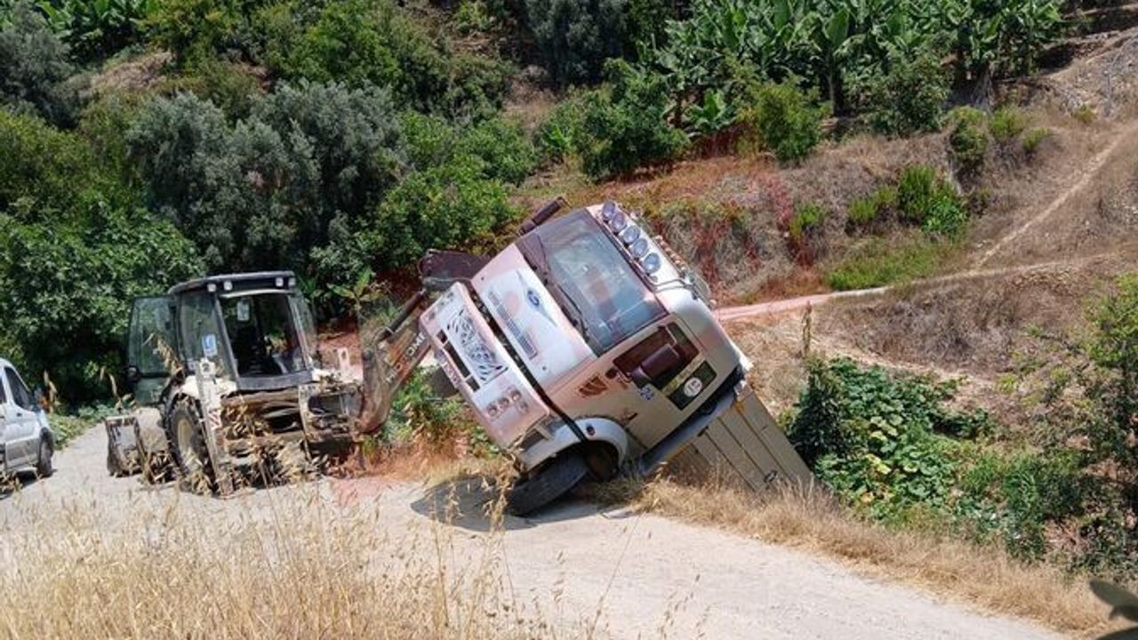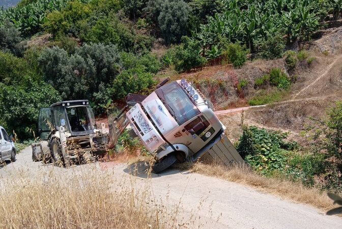 EDİNİLEN bilgiye göre Alanya’nın Kestel Mahallesi, Barcınlar Sokak’ta bulunan Alanya Belediyesi’ne ait zift kamyonu, sürücüsünün kontrolünden çıkarak bir vatandaşa ait avokado bahçesine uçtu. Şans eseri ölen ya da yaralanan kimsenin olmadığı olay sonrası kamyon devrildiği bahçeden çıkarılmaya çalışılıyor. (Mazlume GÖKTAŞ)