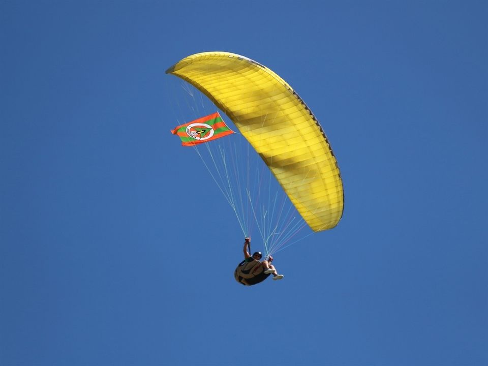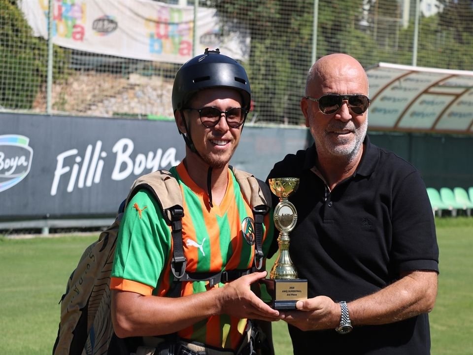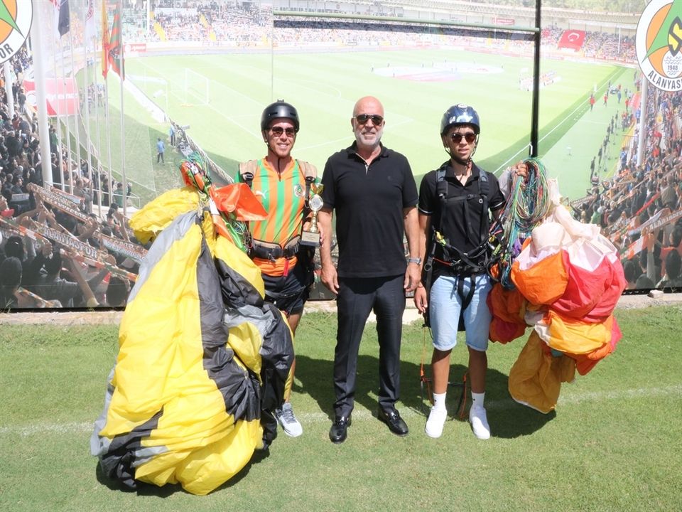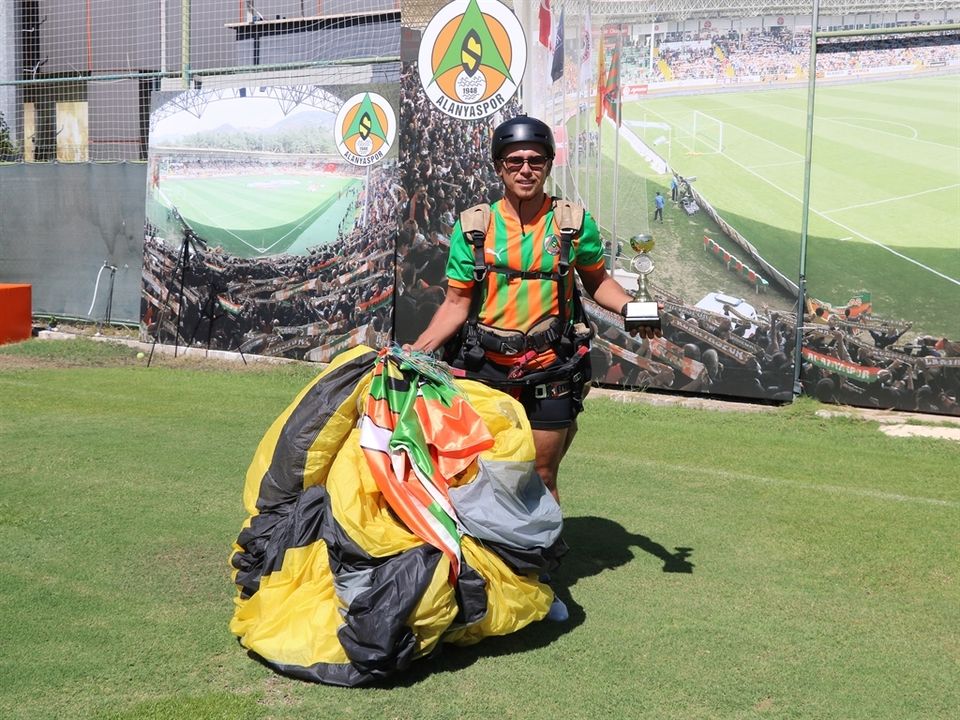 Alanyalı Milli sporcu Harun Karateke, Yamaç Paraşütü Dünya Akro Kupası'nda elde ettiği 3'üncülük kupasını paraşütle kulüp tesislerine inerek Alanyaspor Başkanı Hasan Çavuşoğlu'na verdi