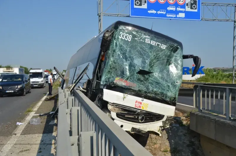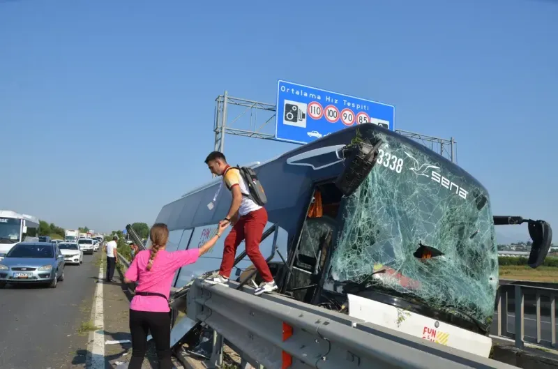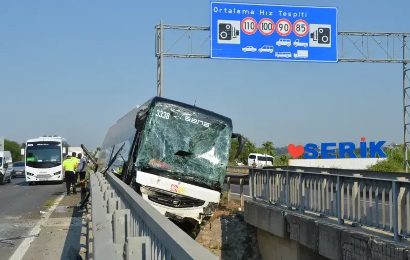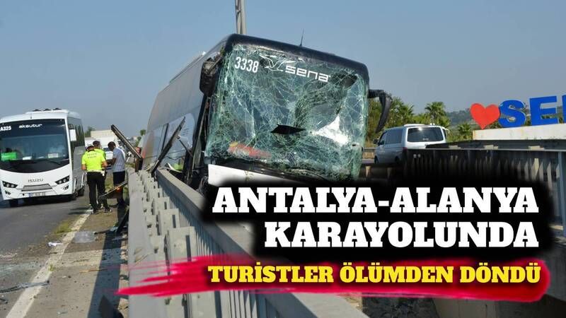 Antalya- Alanya D400 kara yolu Aspendos Köprüsü'nde meydana geldi. Antalya Havalimanı'ndan aldığı 34 turisti tur otobüsüyle Manavgat ve Alanya ilçelerindeki otellerine taşıyan Şeref D., direksiyon kontrolünü yitirdi. Yoldan çıkıp refüjdeki demir bariyerleri parçalayan otobüs, yaklaşık 100 metre ilerledi. Duble yol üzerinde kurulu, altından Köprüçay Irmağı akan köprünün korkuluklarına çarpan otobüs, yaklaşık 30 metre yükseklikten düşmeye ramak kala durdu. Otobüsteki sürücü, rehber ve turistler kazayı yara almadan atlattı. Firmaya ait başka bir araca alınan turistler yola devam etti. Kazaya ilişkin inceleme başlatıldı.