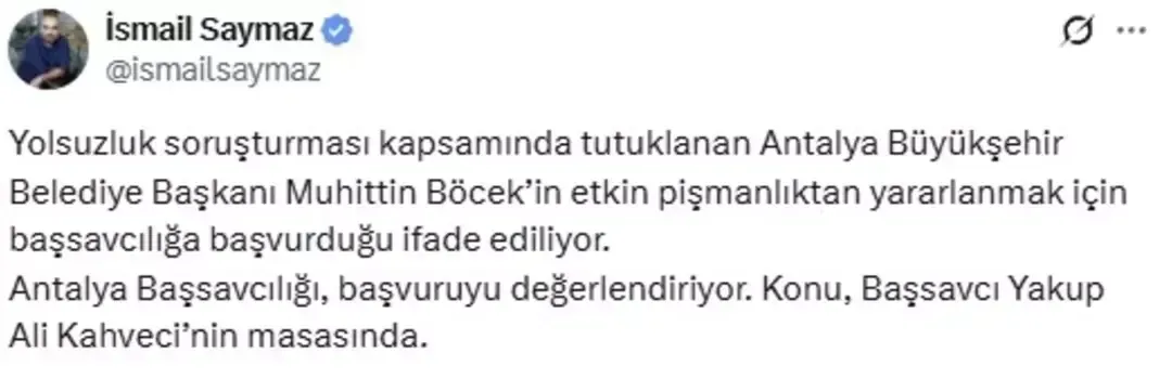 Antalya Cumhuriyet Başsavcılığı tarafından yürütülen rüşvet soruşturması kapsamında tutuklu bulunan Antalya Büyükşehir Belediye Başkanı Muhittin Böcek hakkında dikkat çekici bir iddia ortaya atıldı. Gazeteci İsmail Saymaz, Böcek’in etkin pişmanlıktan yararlanmak amacıyla Antalya Cumhuriyet Başsavcılığı’na başvurduğunu aktardı. Saymaz açıklamasında, “Yolsuzluk soruşturması kapsamında tutuklanan Antalya Büyükşehir Belediye Başkanı Muhittin Böcek’in etkin pişmanlıktan yararlanmak için başsavcılığa başvurduğu ifade ediliyor. Antalya Başsavcılığı, başvuruyu değerlendiriyor. Konu, Başsavcı Yakup Ali Kahveci’nin masasında.” ifadelerini kullandı.