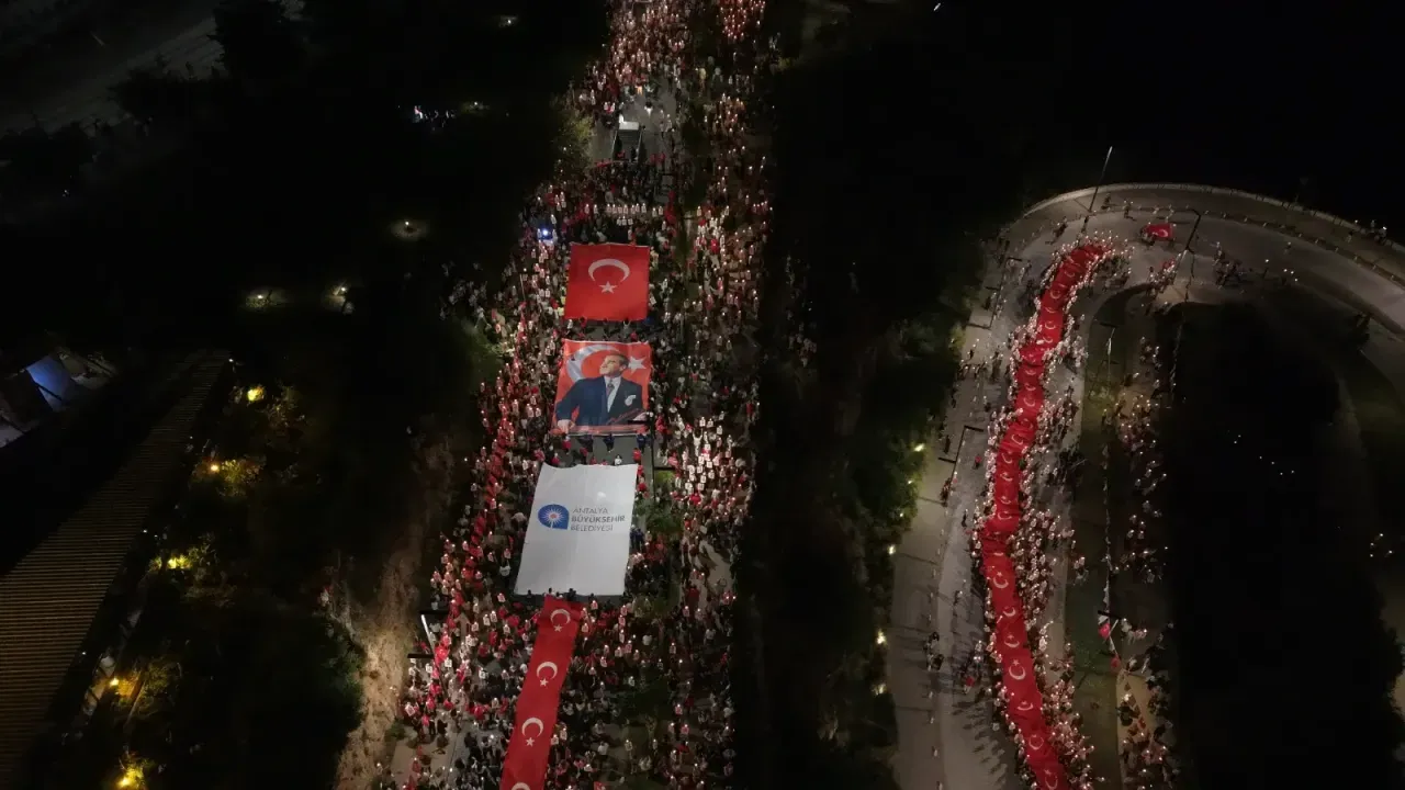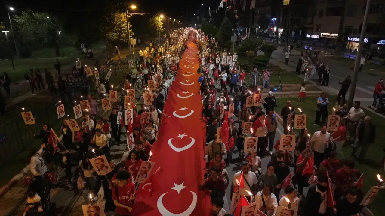 Yürüyüşte öğrenciler tarafından 400 metre uzunluğunda Türk bayrağı taşındı. Sloganların atıldığı, marşların söylendiği Fener Alayı, Cumhuriyet Meydanı’na kadar sürdü. Bazı vatandaşların bebekleri ve çocuklarıyla, bazılarının ise evcil hayvanlarıyla katıldığı yürüyüşe 7’den 70’e katılım sağlandı.