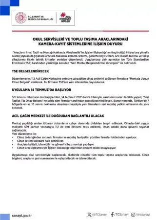 Sanayi ve Teknoloji Bakanlığı, 14 Temmuz 2025 itibarıyla Türkiye genelinde olduğu gibi Antalya'da da okul servisleri ve toplu taşıma araçlarına yönelik güvenlik sistemlerinin zorunlu hale geldiğini duyurdu. Yeni uygulamayla birlikte şehir içi taşımacılıkta yolcu güvenliği ve denetim kapasitesi artırılıyor.