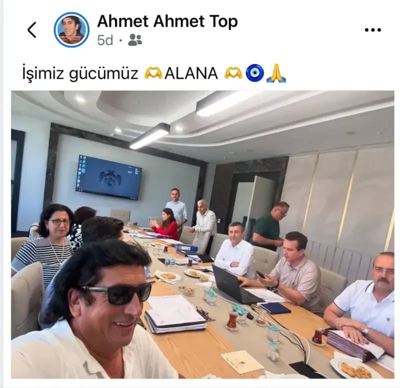 Toplantı odasında yapılan toplantıya güneş gözlüğüyle katılıp çektiği fotoğrafı "İşimiz Gücümüz ALANA" notuyla paylaşması ciddiyetten uzak tavrıyla eleştirilerin odağı oldu.