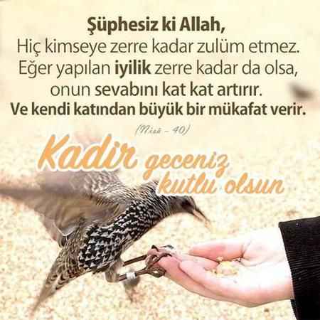Şühpesiz ki Allah, hiç kimseye zerre kadar zulüm etmez. Eğer yapılan iyilik zerre kadar da olsa, onun sevabını kat kat arttırır. Ve Kendi katından büyük bir mükafat verir. Kadir Geceniz Kutlu Olsun.