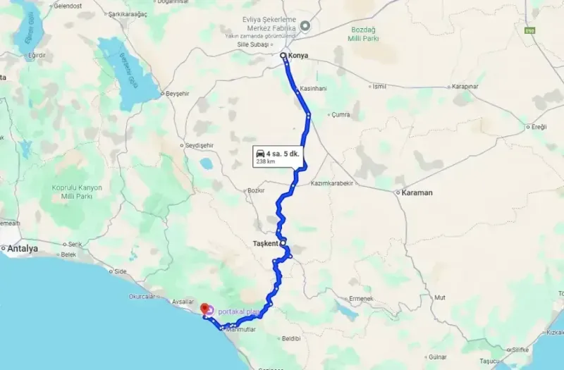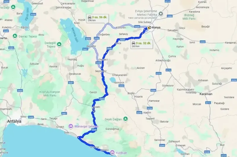 Konya’dan Alanya’ya gitmek isteyenler için iki farklı güzergah öne çıkıyor: Taşkent-Kuşyuvası yolu ve Seydişehir yolu. Google Haritalar verilerine göre mesafe açısından farklılık olsa da yol koşulları tercihte belirleyici oluyor.