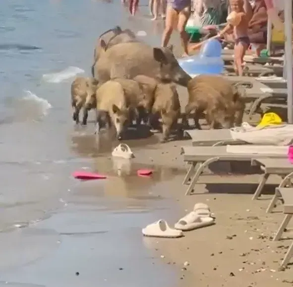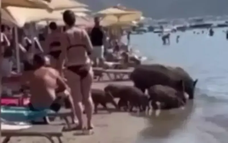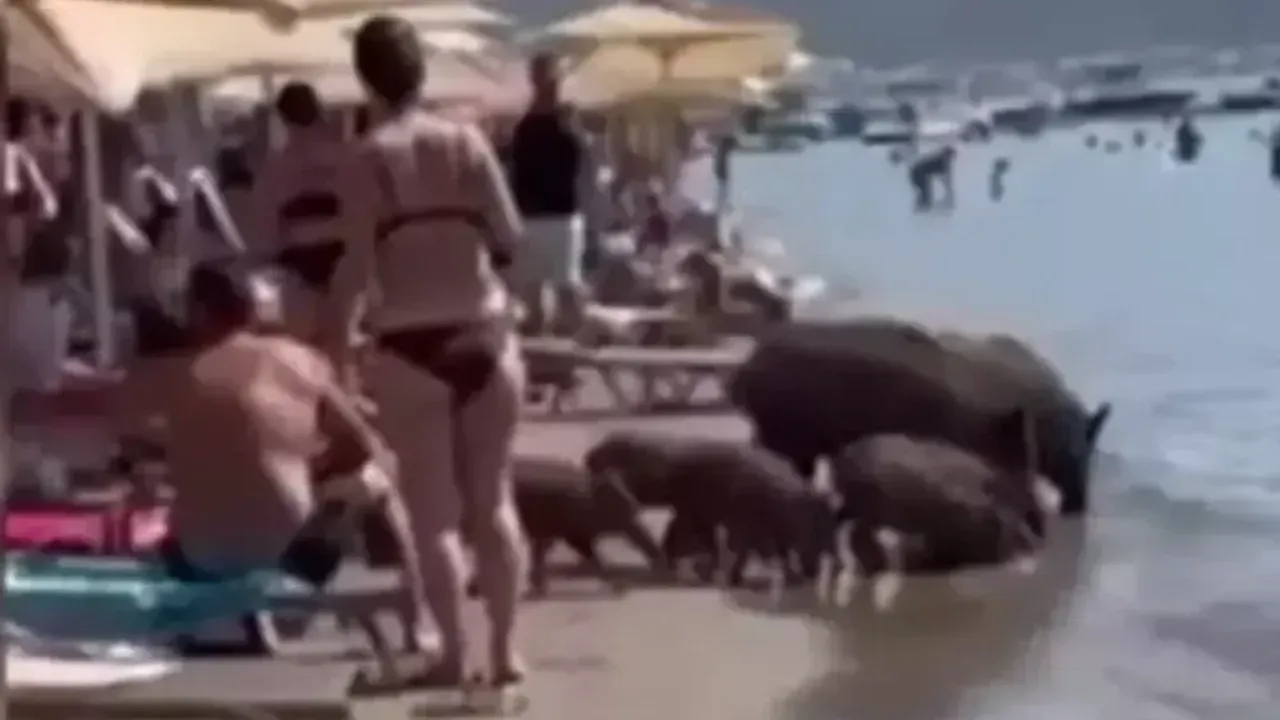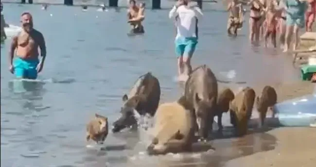 Bir süre tatilcilerin arasından geçen domuzlar, daha sonra denize girerek serinlemeye başladı. Suya alışık olmayanlar için sıra dışı bir manzara oluşturan bu durum, çevredekiler tarafından cep telefonlarıyla kayıt altına alındı. Yaban domuzları, denizde bir süre vakit geçirdikten sonra yeniden karaya çıkıp sahil bölgesinden uzaklaştı.
