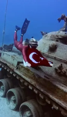 Dünya Şampiyonası için hazırlıklarını Kaş'ta sürdüren milli sporcu Şahika Ercümen, 30 Ağustos Zafer Bayramı dolayısıyla dalış yaptı. Türk Silahlı Kuvvetleri (TSK) envanterinde ekonomik ömrünü tamamladıktan sonra Antalya Valiliği tarafından Kaş'a bağlı Güvercin Adası yakınlarında batırılan tanka dalış yapan Şahika Ercümen, Türk bayrağı açtı. Yaklaşık 15 metre derinlikteki tanka dalış yapan Şahika Ercümen, bu anlara ait görüntüleri sosyal medya hesabında, "30 Ağustos Zafer Bayramı. Zafer, 'zafer benimdir' diyebilenindir. Başarı ise 'başaracağım' diye başlayarak sonunda 2başardım' diyebilenindir. Mustafa Kemal Atatürk" ifadeleriyle paylaştı. Ercümen'in paylaşımı kısa sürede çok sayıda beğeni ve yorum aldı. (DHA)