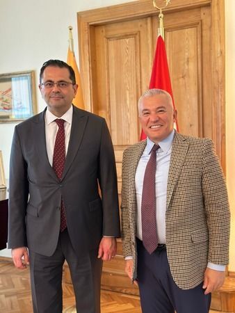 Şahin, Büyükelçi Tantekin'e Litvanya'da Türkiye ve Alanya'nın çok sevildiğini bir kez daha görmekten büyük mutluluk duyduğunu söyledi. (Mazlume GÖKTAŞ)