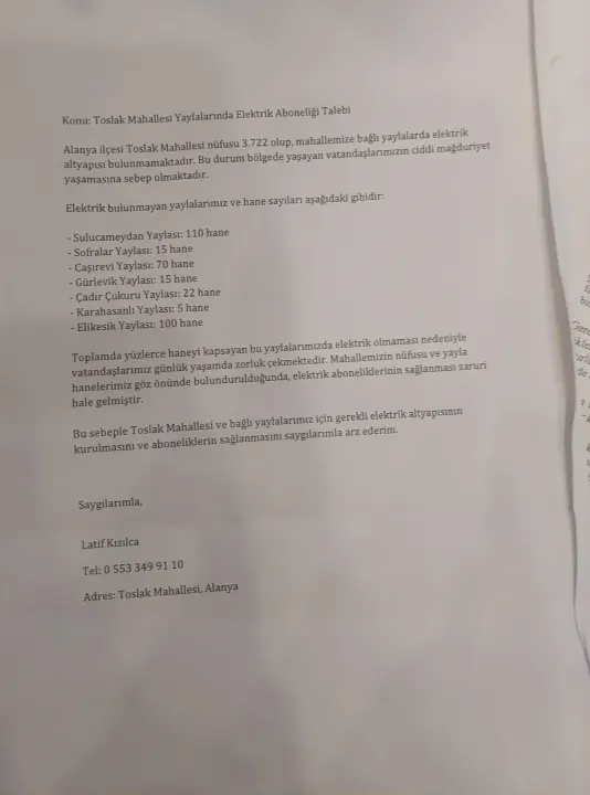 Alanya’nın Toslak Mahallesi’nde yaşayan vatandaşlar, mahalleye bağlı yaylalarda elektrik altyapısının bulunmamasından dolayı günlük yaşamda ciddi zorluklar yaşıyor. Mahalle sakinlerinden Latif Kızılca, yetkililere elektrik aboneliklerinin sağlanması ve altyapının kurulması yönünde talepte bulundu.