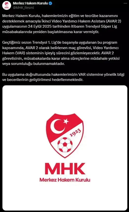 Türkiye Futbol Federasyonu (TFF) Merkez Hakem Kurulu (MHK), İkinci Video Yardımcı Hakem Asistanı (AVAR 2) uygulamasının Trendyol Süper Lig müsabakalarında yeniden başlatılacağını açıkladı. Uygulama, hakemlerin VAR sistemi konusunda deneyim ve bilgi kazanmasını hedefliyor.