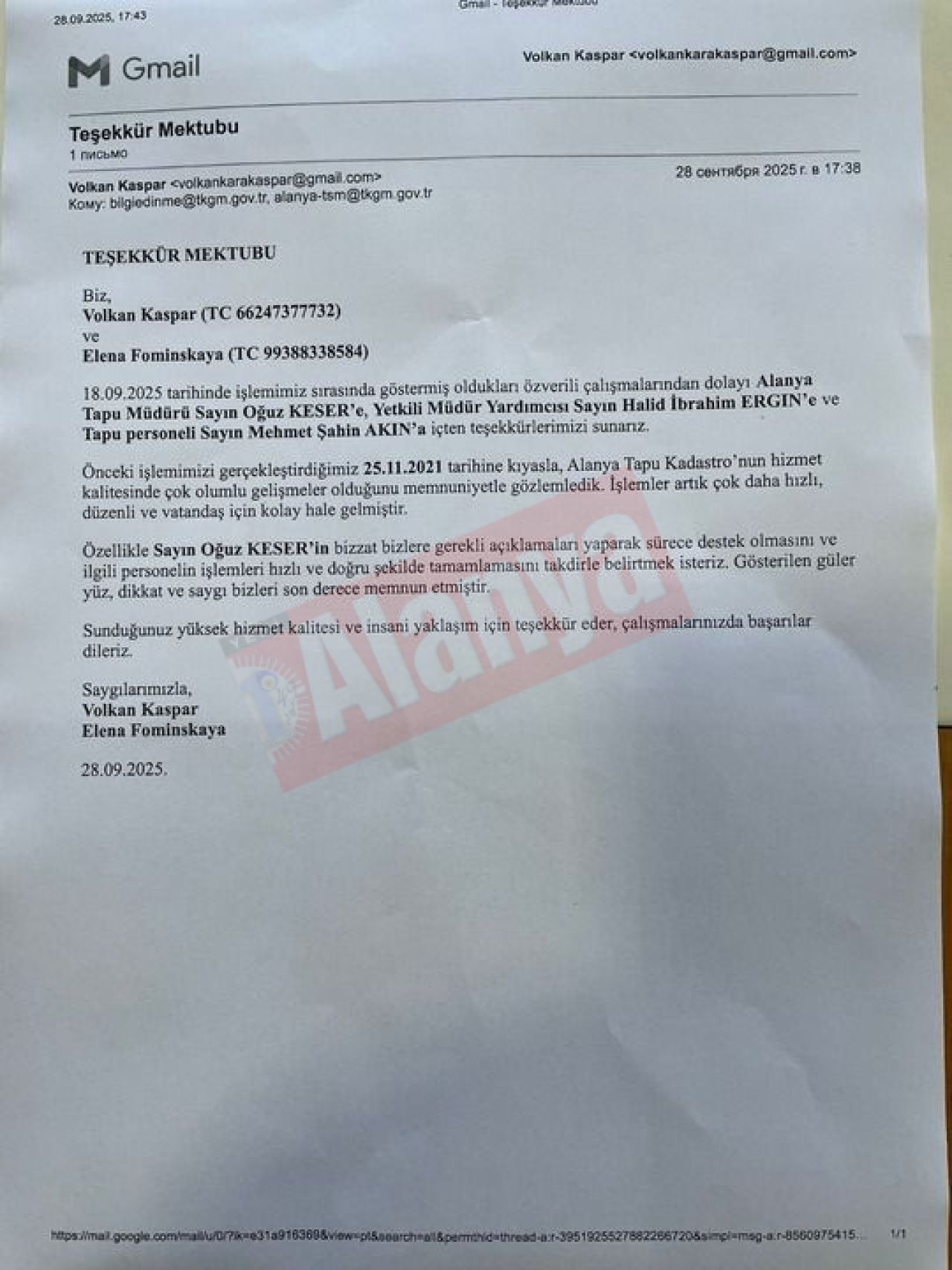 ALANYA’DA ikamet eden Volkan (Vilademir) Kaspar ve Elena Fominskaya, 18 Eylül 2025 tarihinde gerçekleştirdikleri işlem sonrası Alanya Tapu Müdürlüğü’ne teşekkürlerini iletti. Hazırladıkları mektupta Tapu Müdürü Oğuz Keser, Müdür Yardımcısı Halid İbrahim Ergin ve personel Mehmet Şahin Akın’ın özverili çalışmalarını takdir ettiklerini ifade eden Kaspar ve Fominskaya, önceki yıllara kıyasla hizmet kalitesindeki olumlu gelişmeleri de vurguladı. Mektupta, “Biz, Volkan Kaspar ve Elena Fominskaya 18.09.2025 tarihinde işlemimiz sırasında göstermiş oldukları özverili çalışmalarından dolayı Alanya Tapu Müdürü Sayın Oğuz Keser'e, Yetkili Müdür Yardımcısı Sayın Halid İbrahim Ergın'e ve Tapu personeli Sayın Mehmet Şahin Akın'a içten teşekkürlerimizi sunarız. Önceki işlemimizi gerçekleştirdiğimiz 25.11.2021 tarihine kıyasla, Alanya Tapu Kadastro'nun hizmet kalitesinde çok olumlu gelişmeler olduğunu memnuniyetle gözlemledik. İşlemler artık çok daha hızlı, düzenli ve vatandaş için kolay hale gelmiştir. Özellikle Sayın Oğuz Keser'in bizzat bizlere gerekli açıklamaları yaparak sürece destek olmasını ve ilgili personelin işlemleri hızlı ve doğru şekilde tamamlamasını takdirle belirtmek isteriz. Gösterilen güler yüz, dikkat ve saygı bizleri son derece memnun etmiştir. Sunduğunuz yüksek hizmet kalitesi ve insani yaklaşım için teşekkür eder, çalışmalarınızda başarılar dileriz” ifadelerine yer verdiler.