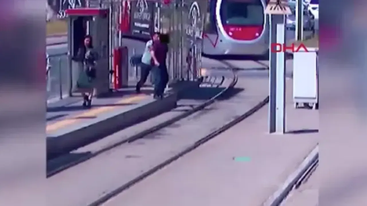 Kayseri’de bir vatandaş tramvayın geldiğini fark etmeyip, tramvay hattından karşıya geçmek istedi. O sırada vatandaşın raylara yöneldiğini gören güvenlik görevlisi, vatandaşı kolundan tutarak geri çekti. O anlar güvenlik kamerasına yansıdı.